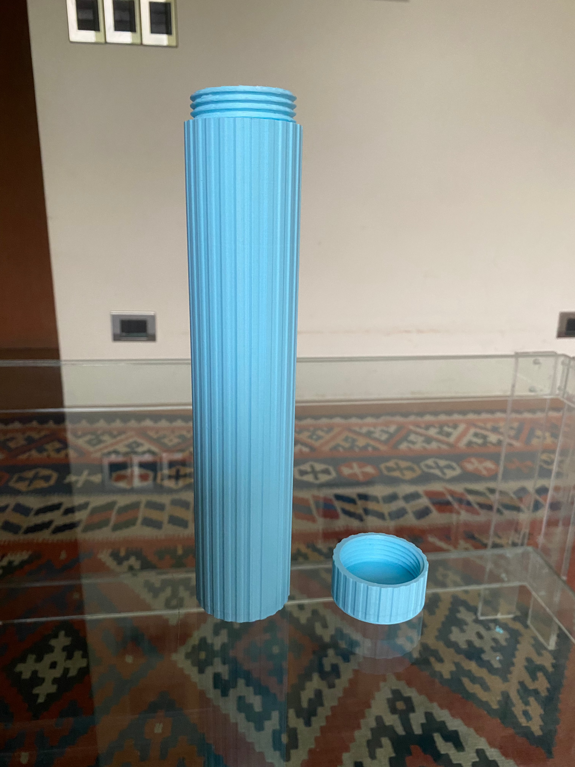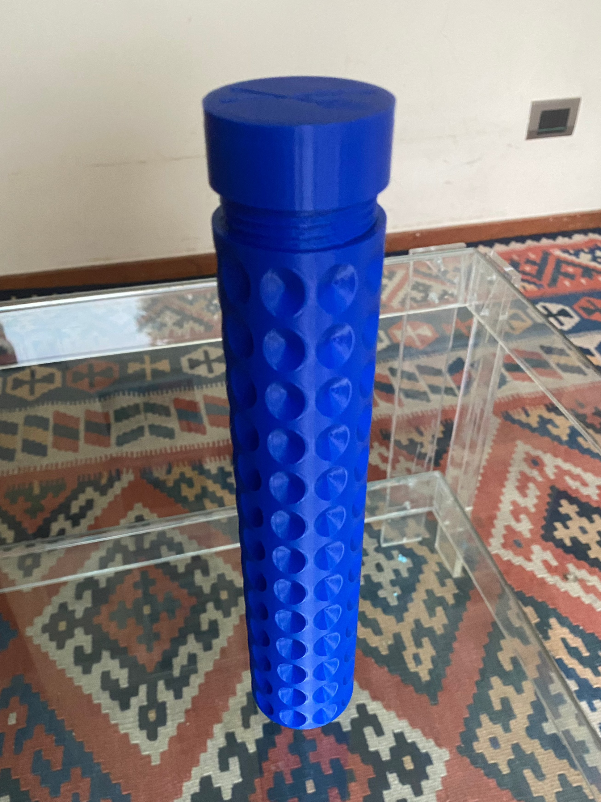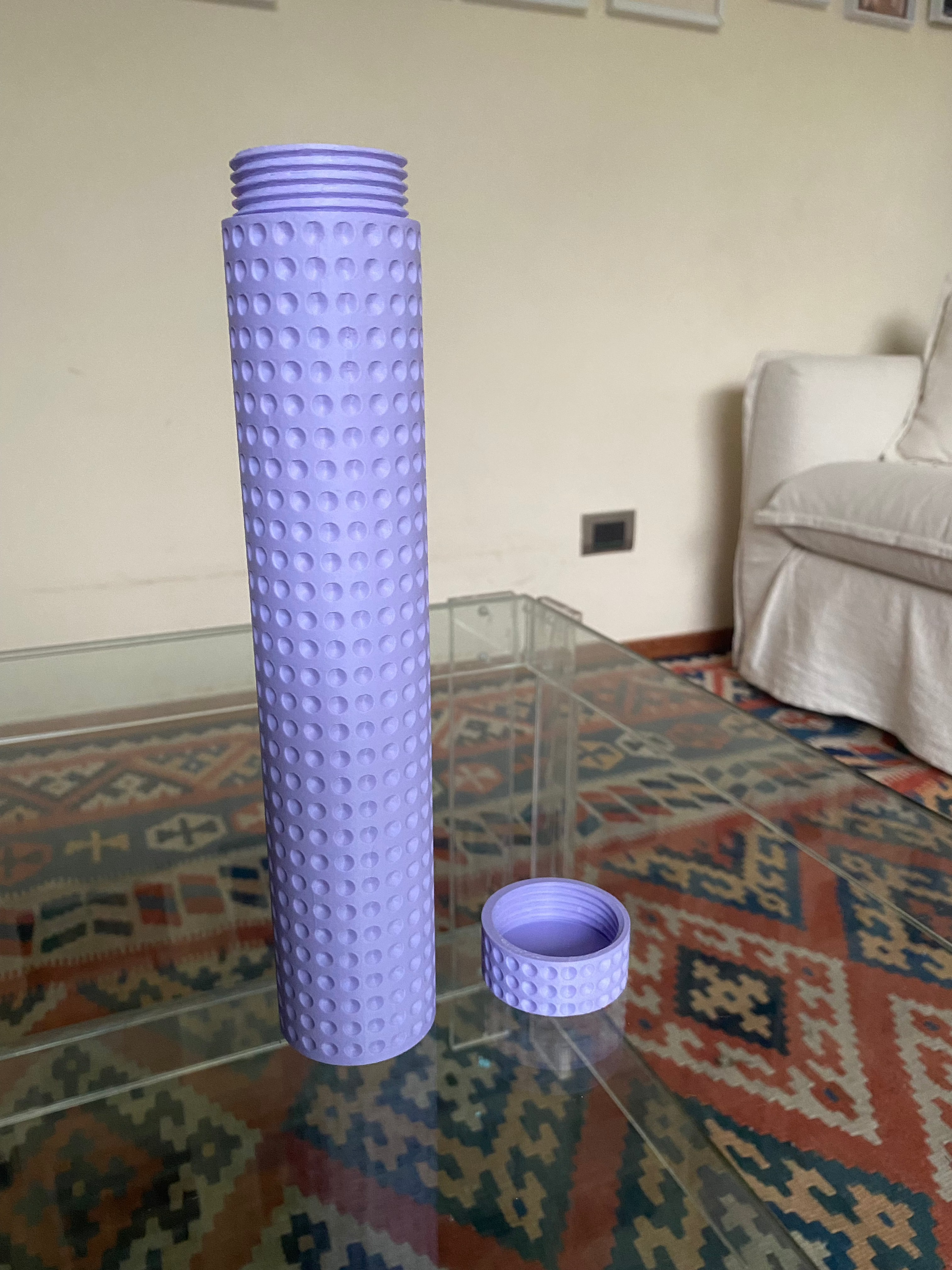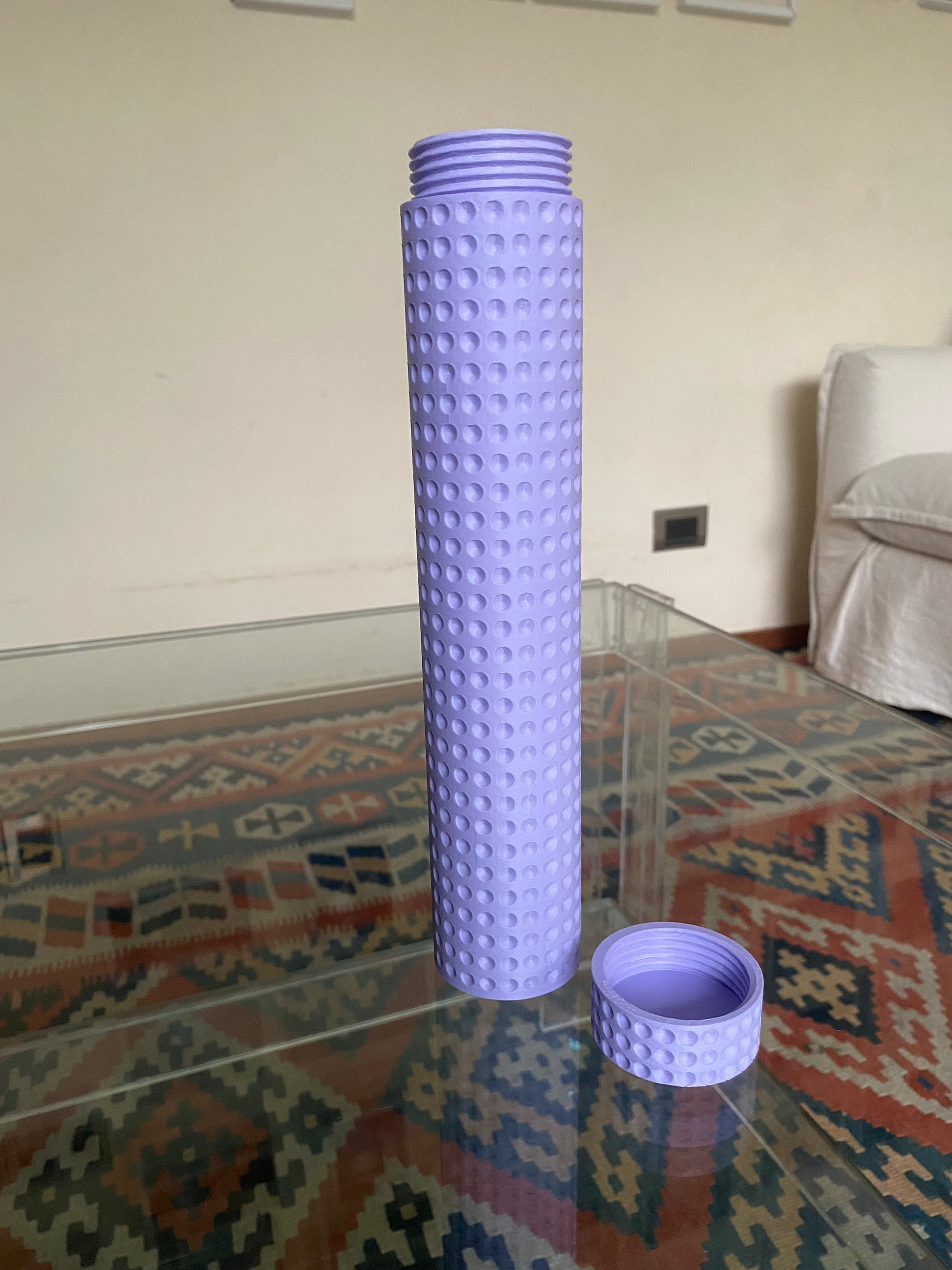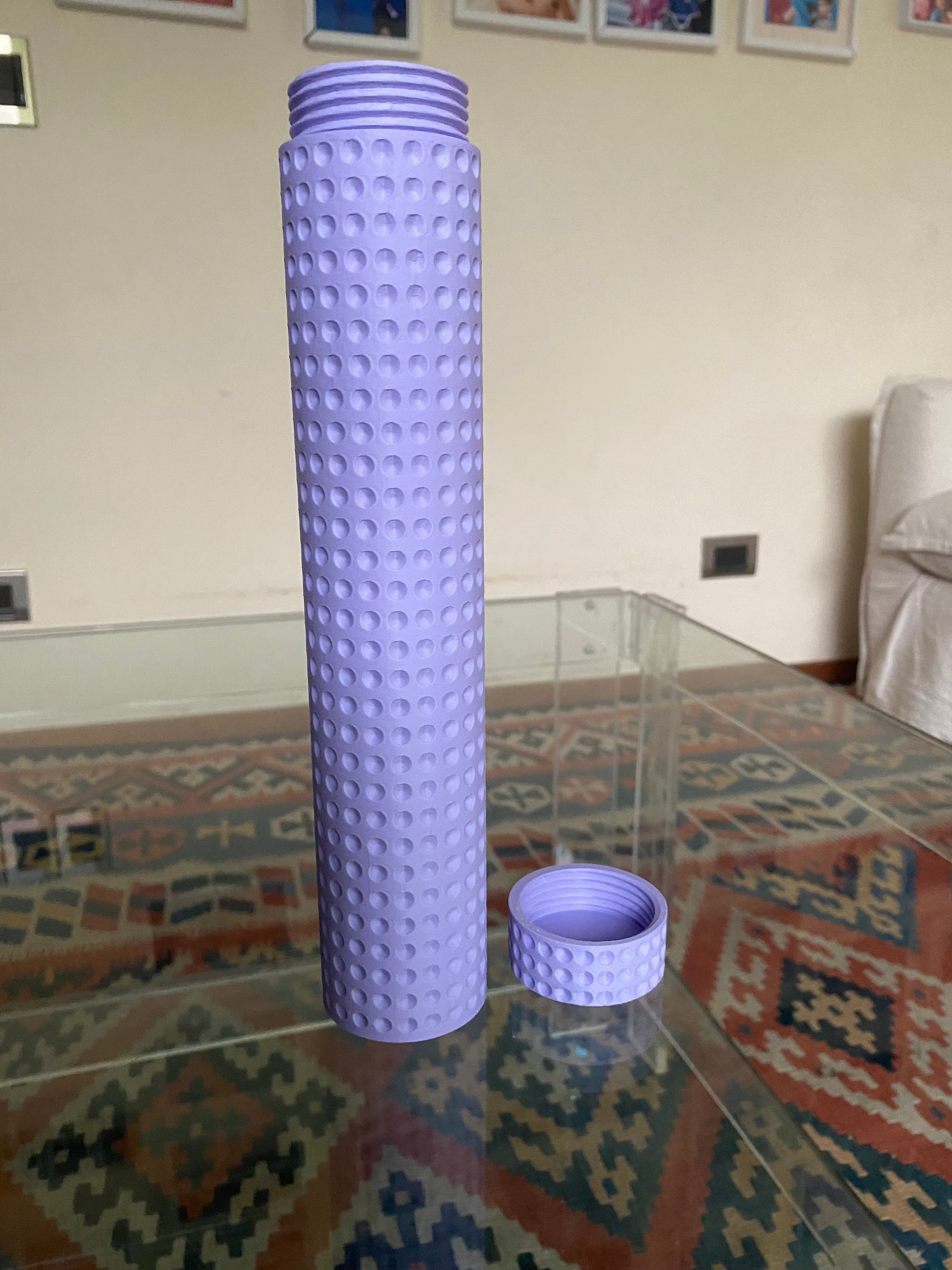 Mide 25 cm de alto y 5 cm de diámetro, ideal para llevar en cualquier bolso.