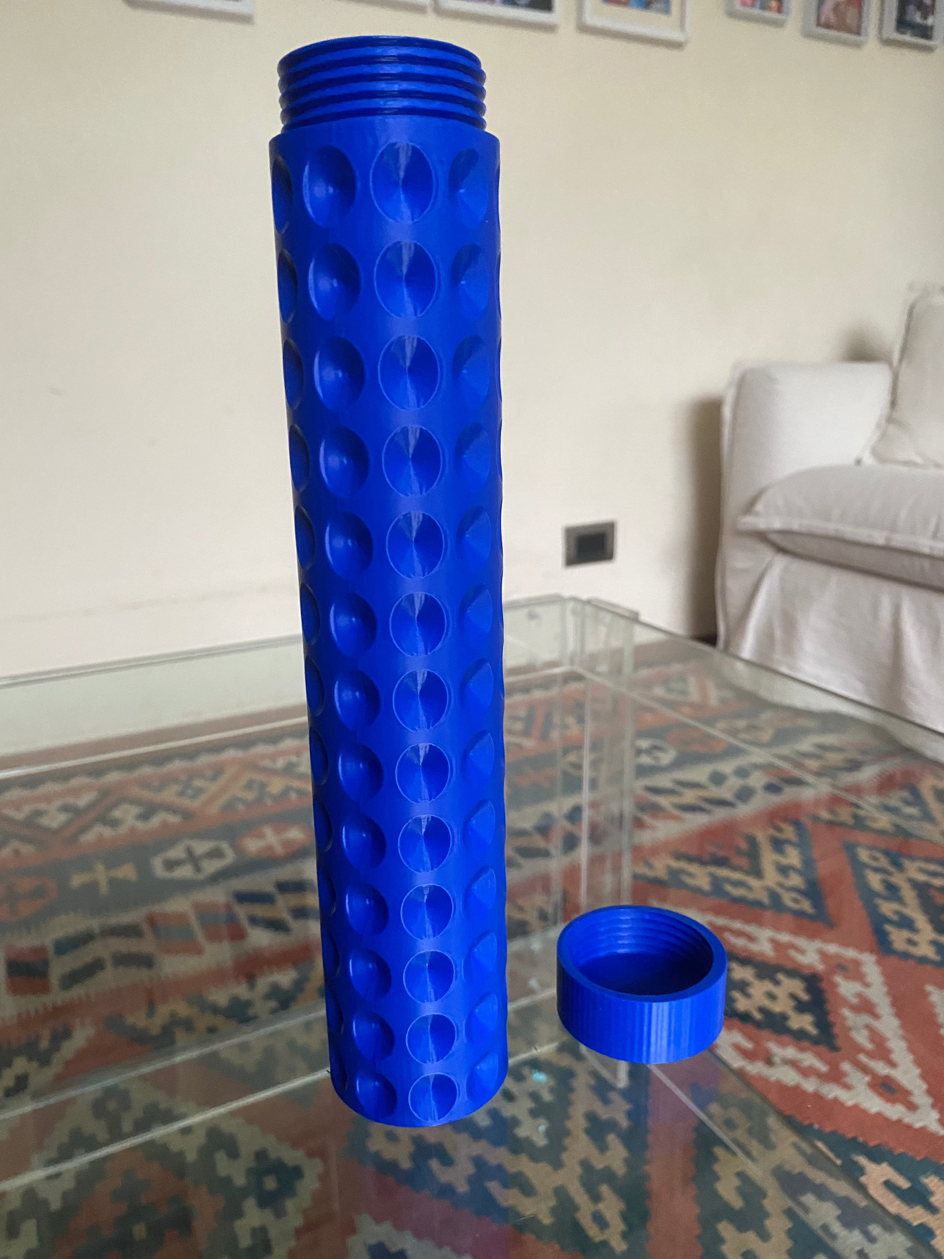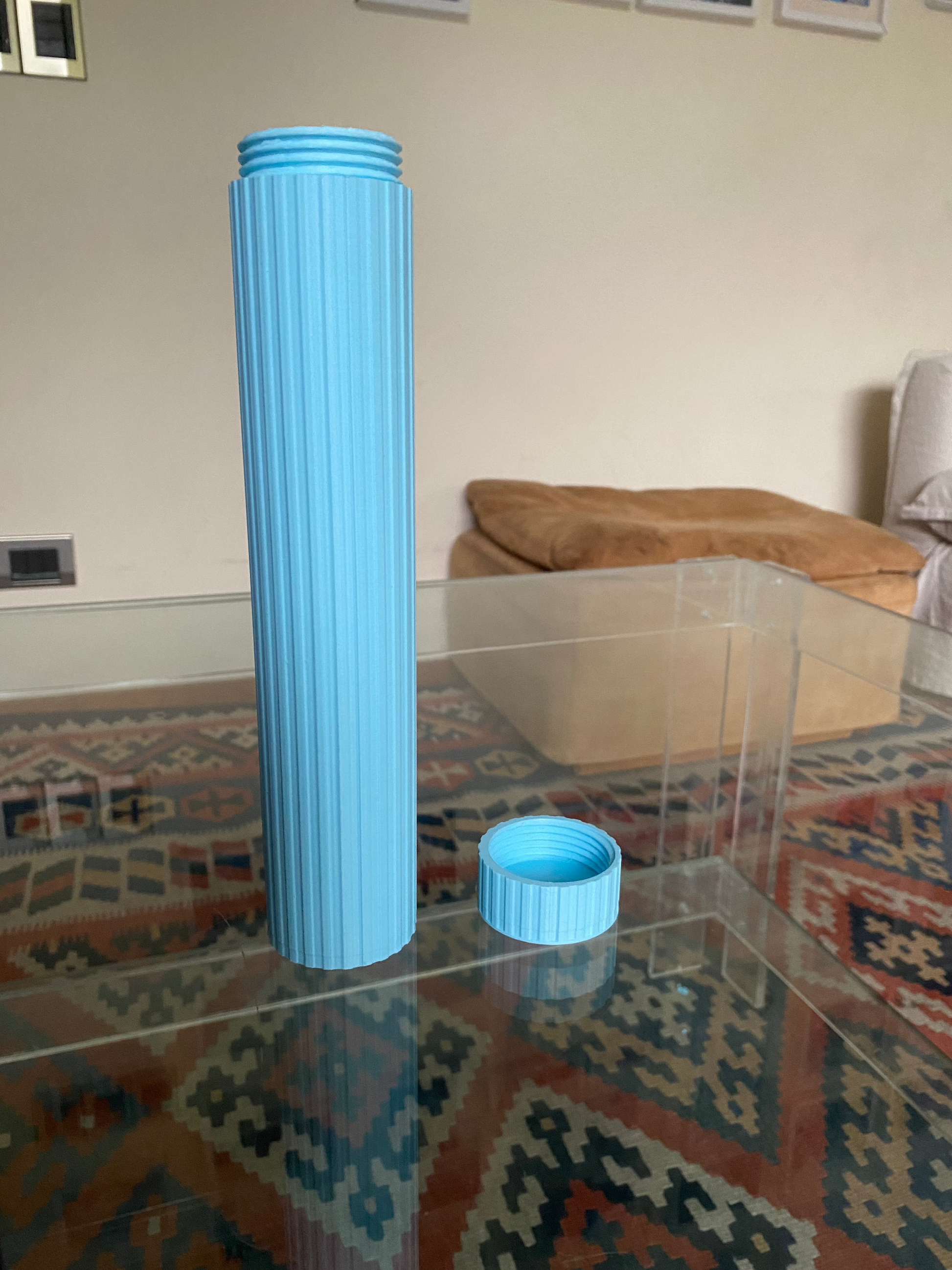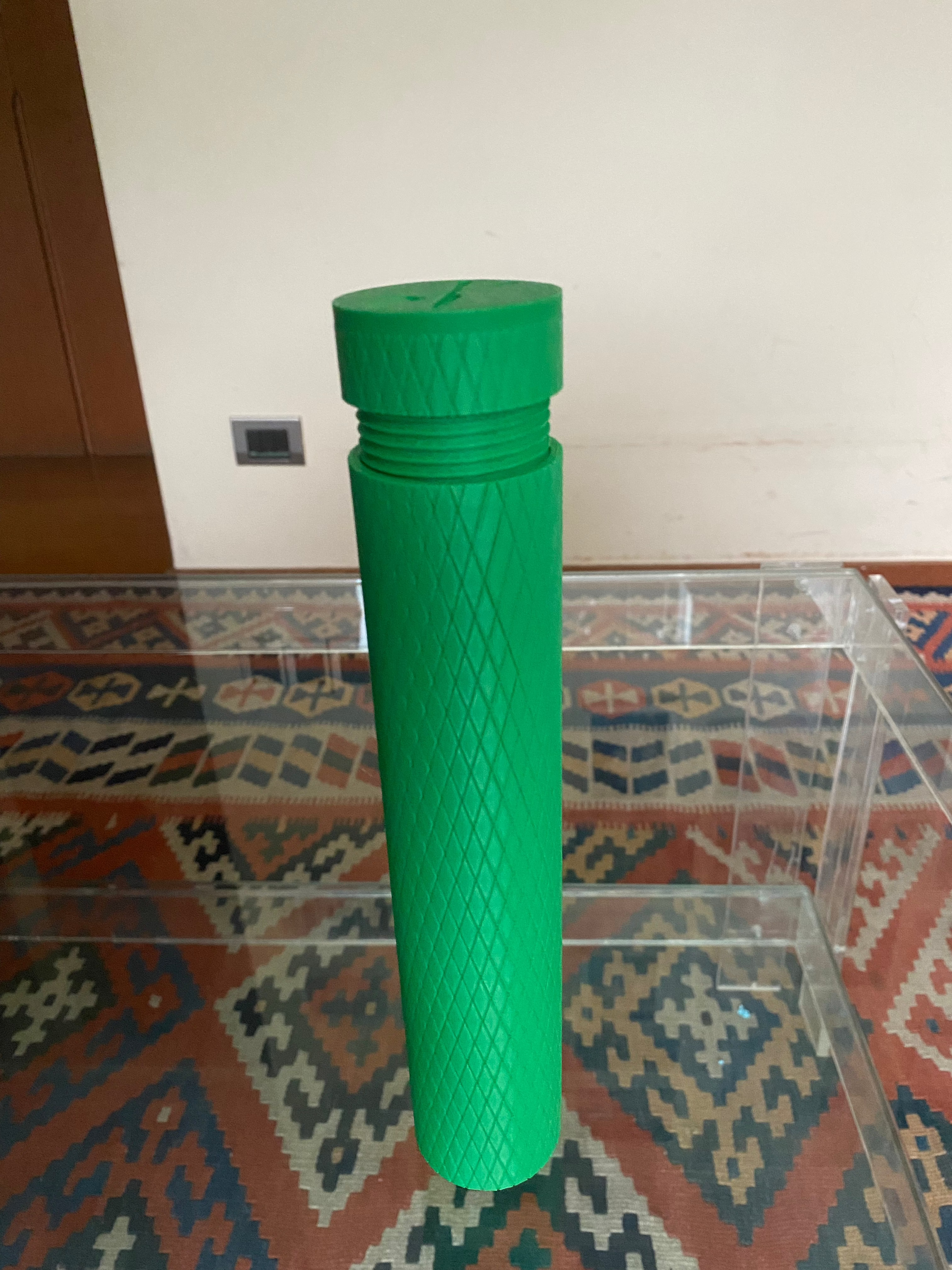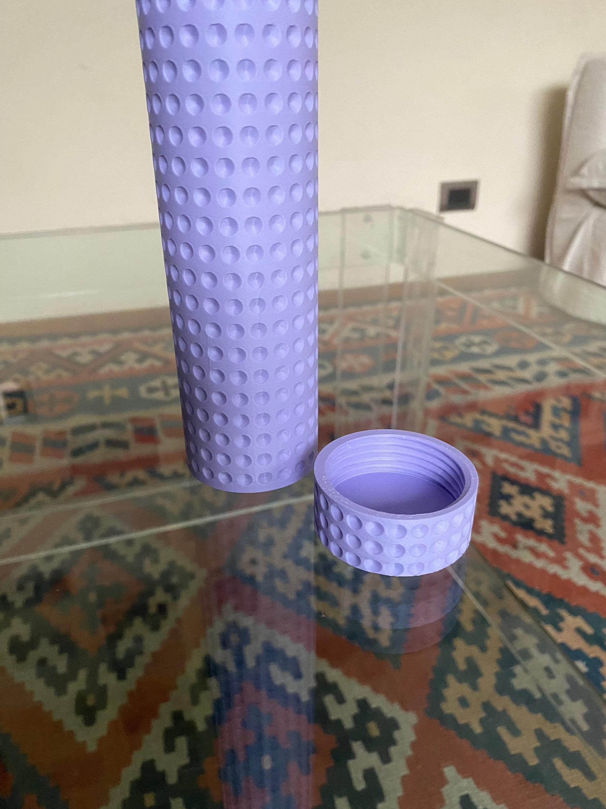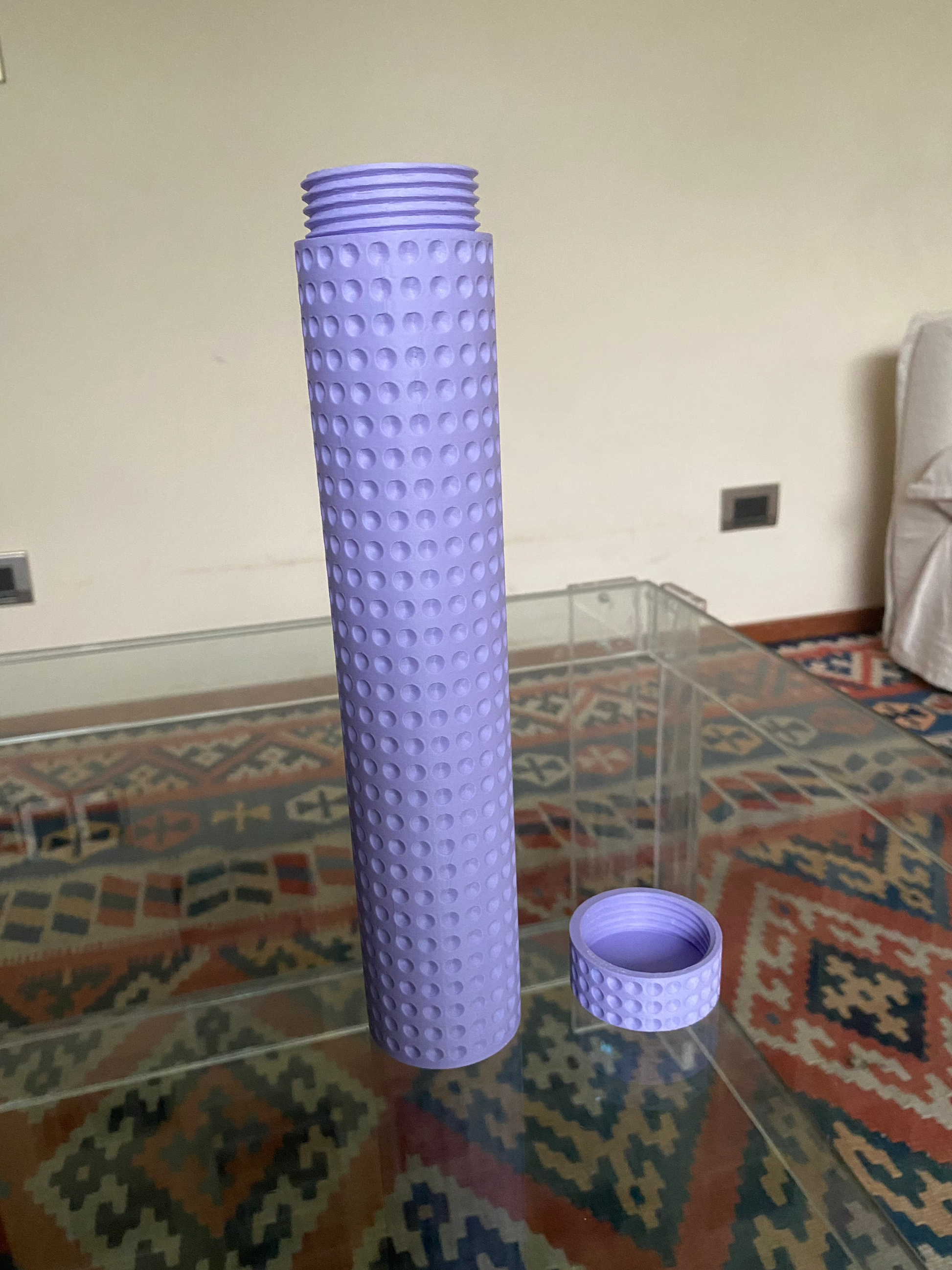 Mide 25 cm de alto y 5 cm de diámetro, ideal para llevar en cualquier bolso.