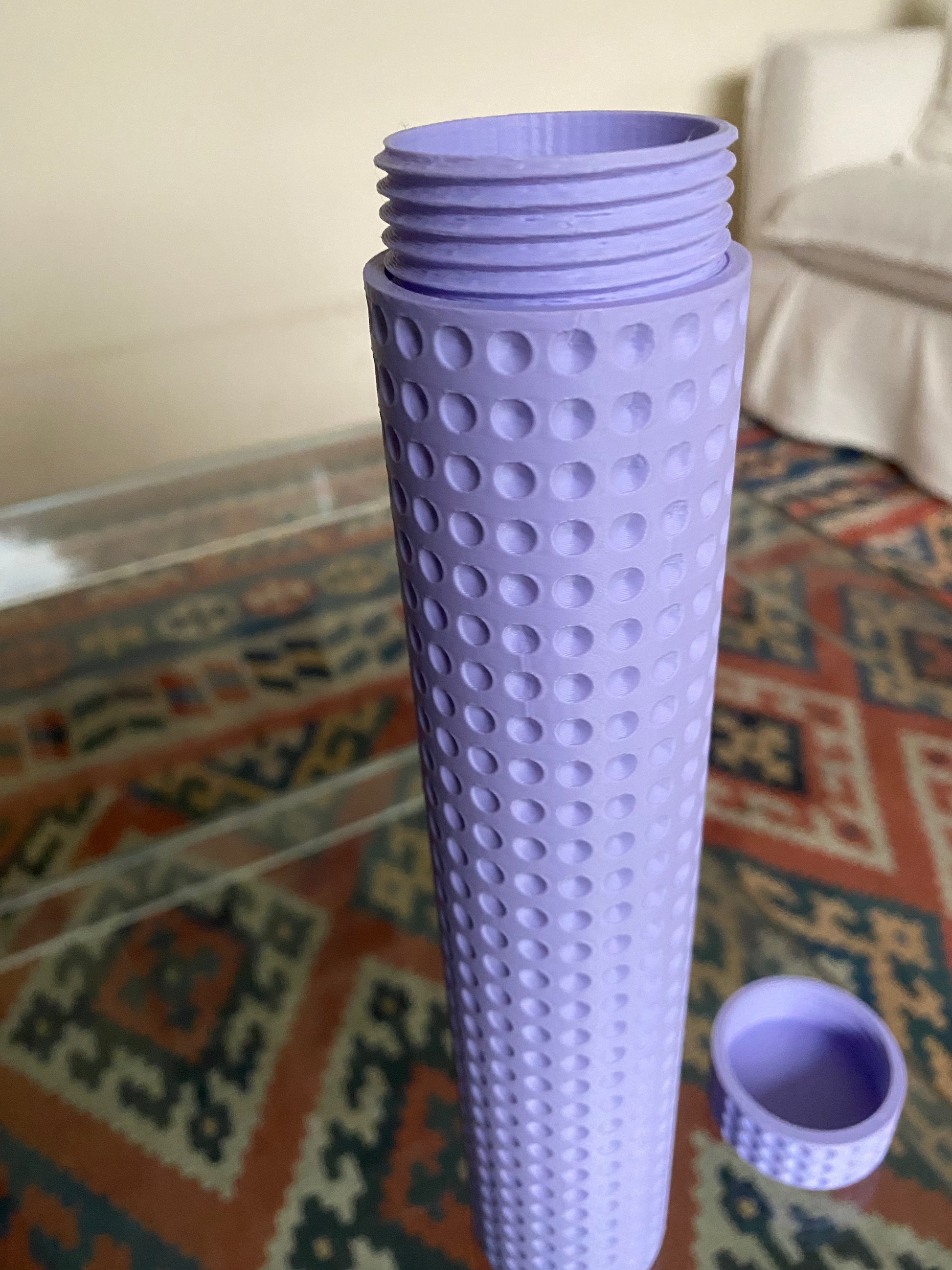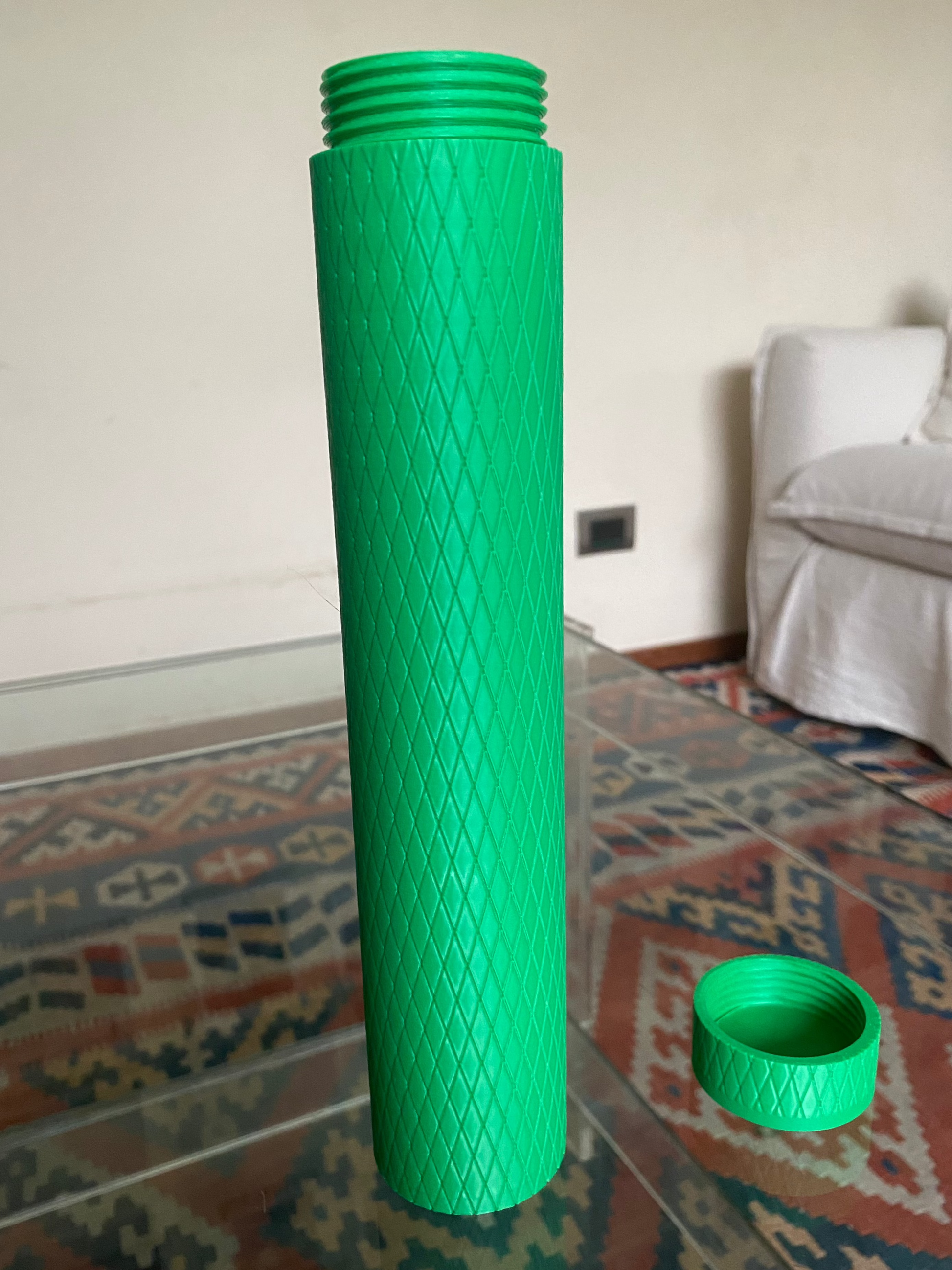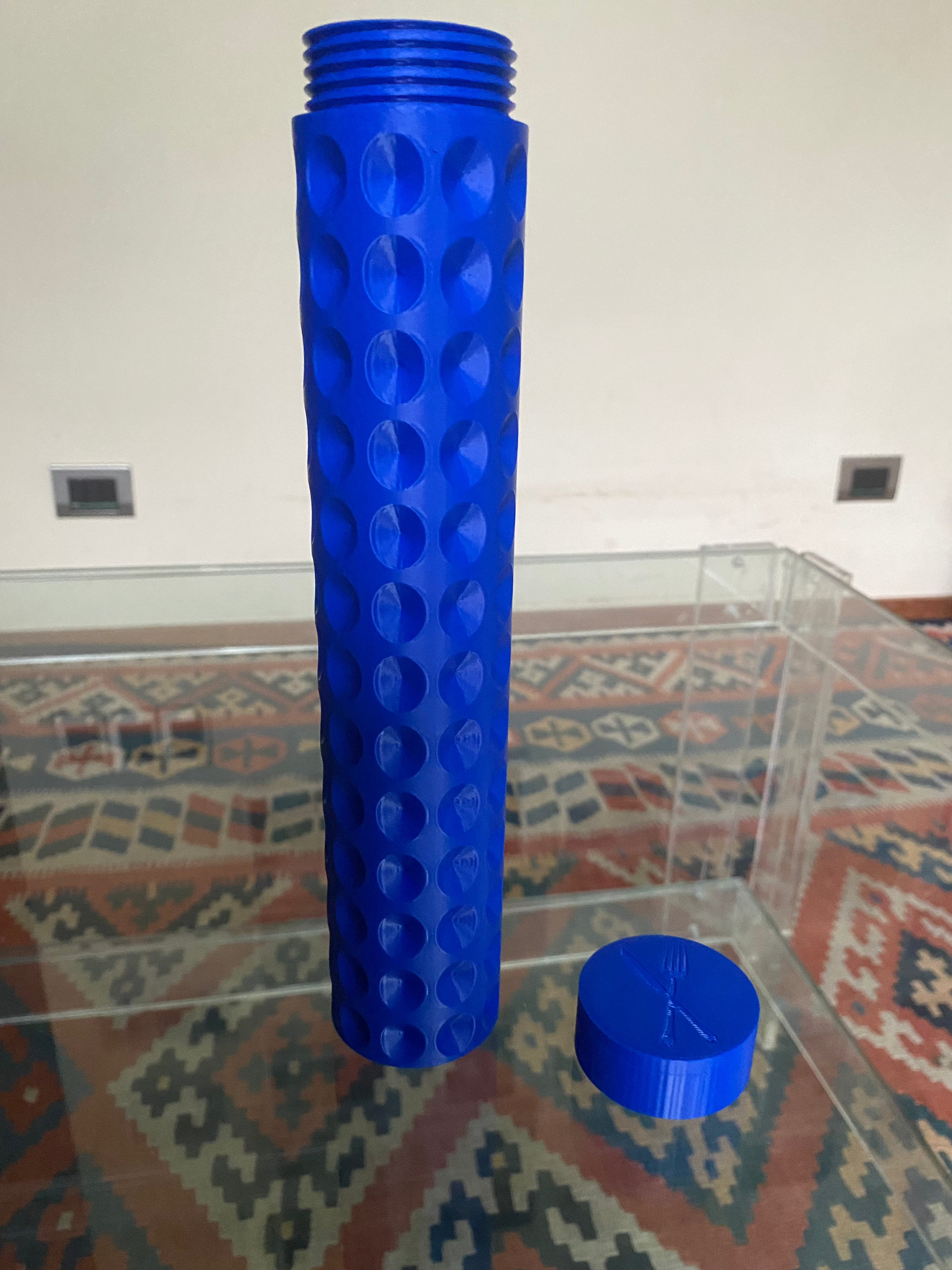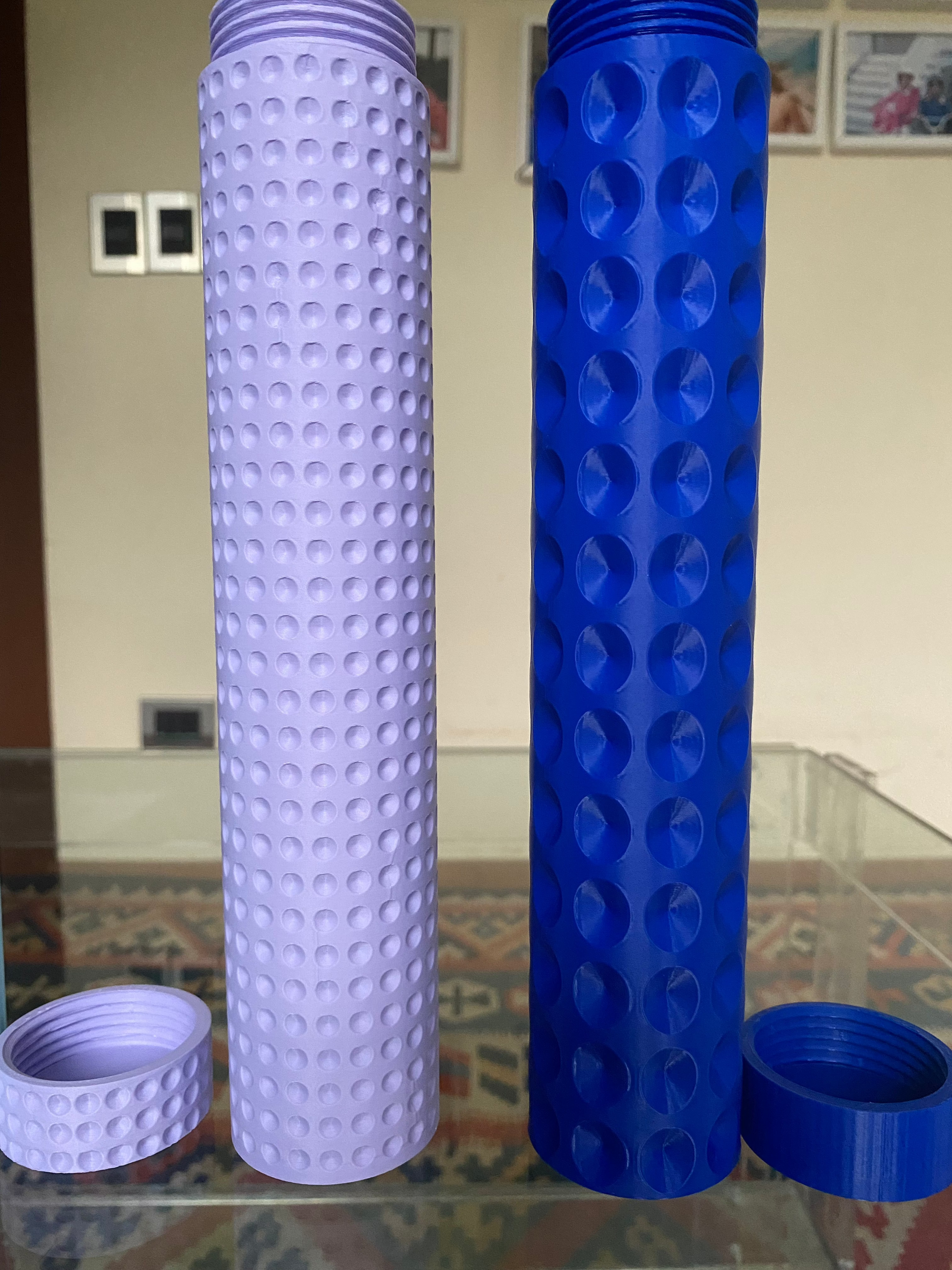 Mide 25 cm de alto y 5 cm de diámetro, ideal para llevar en cualquier bolso.