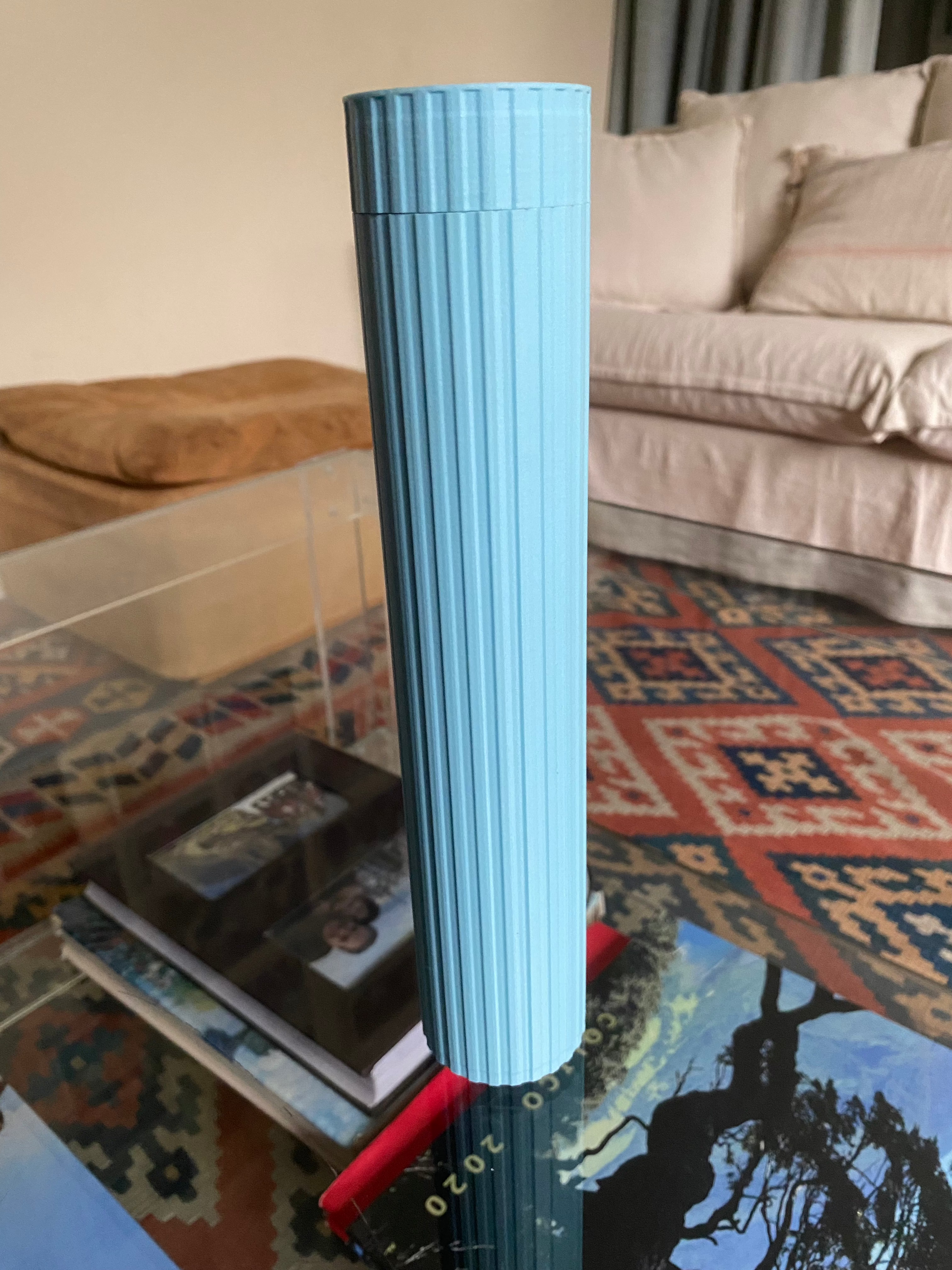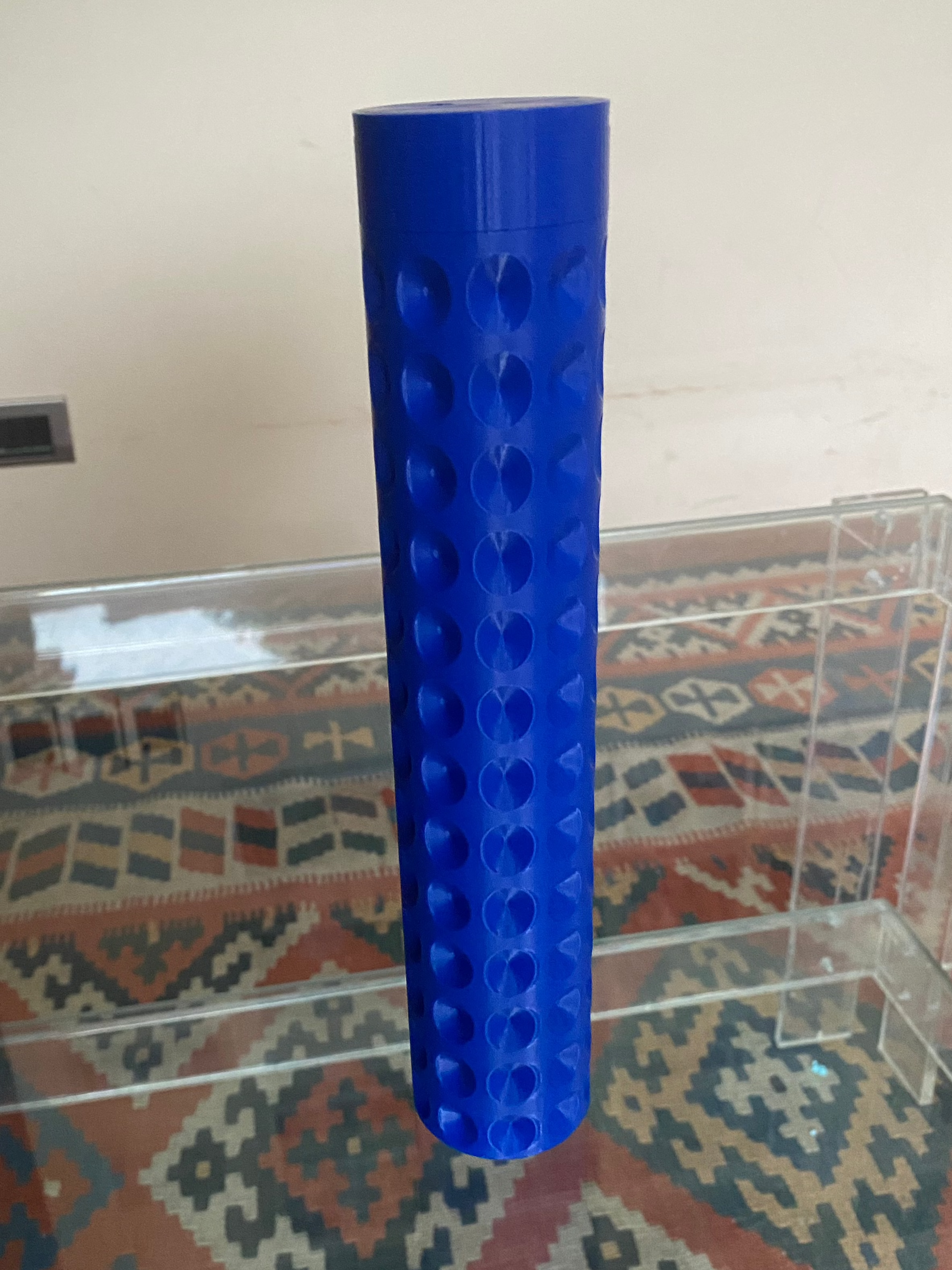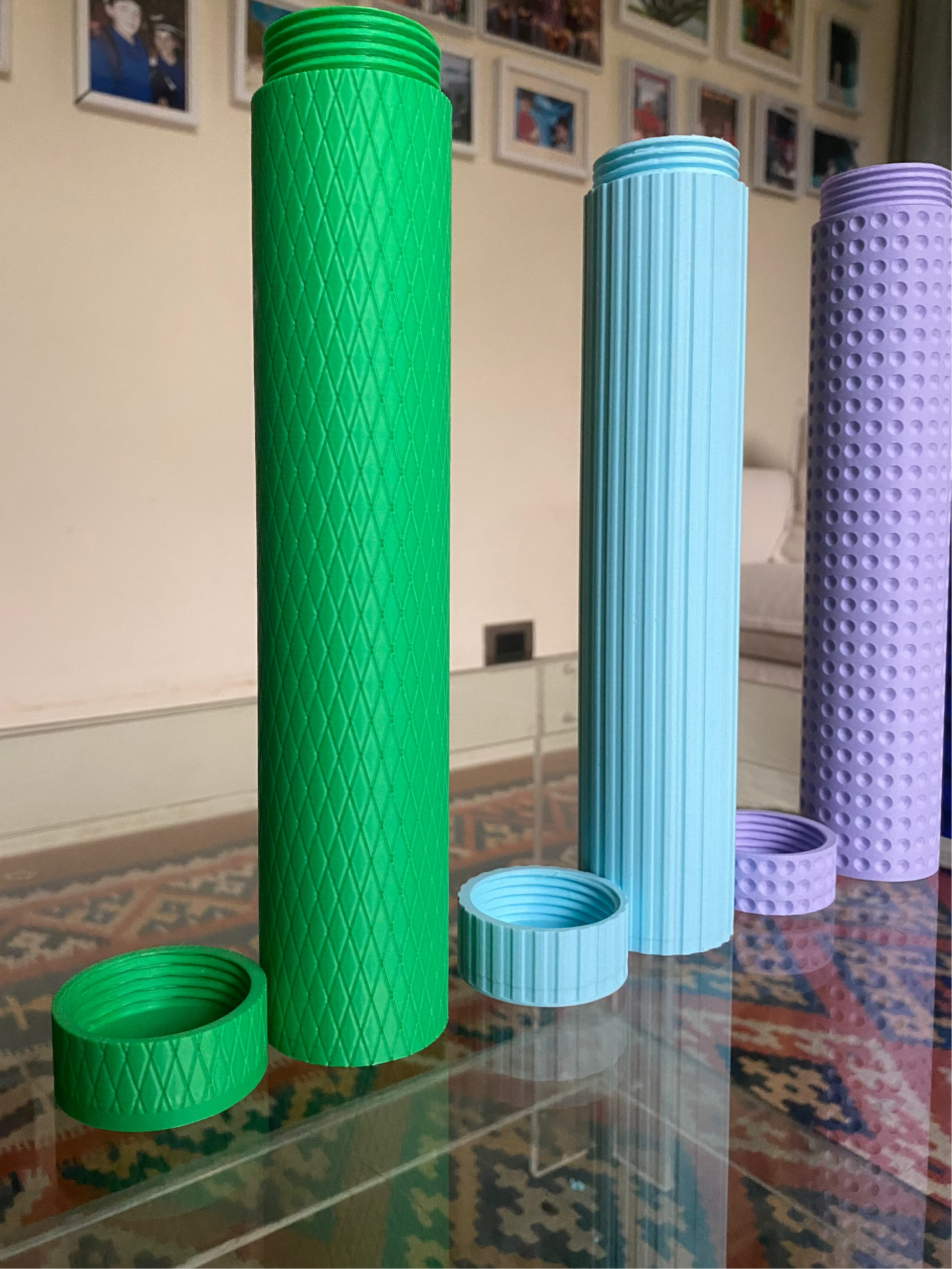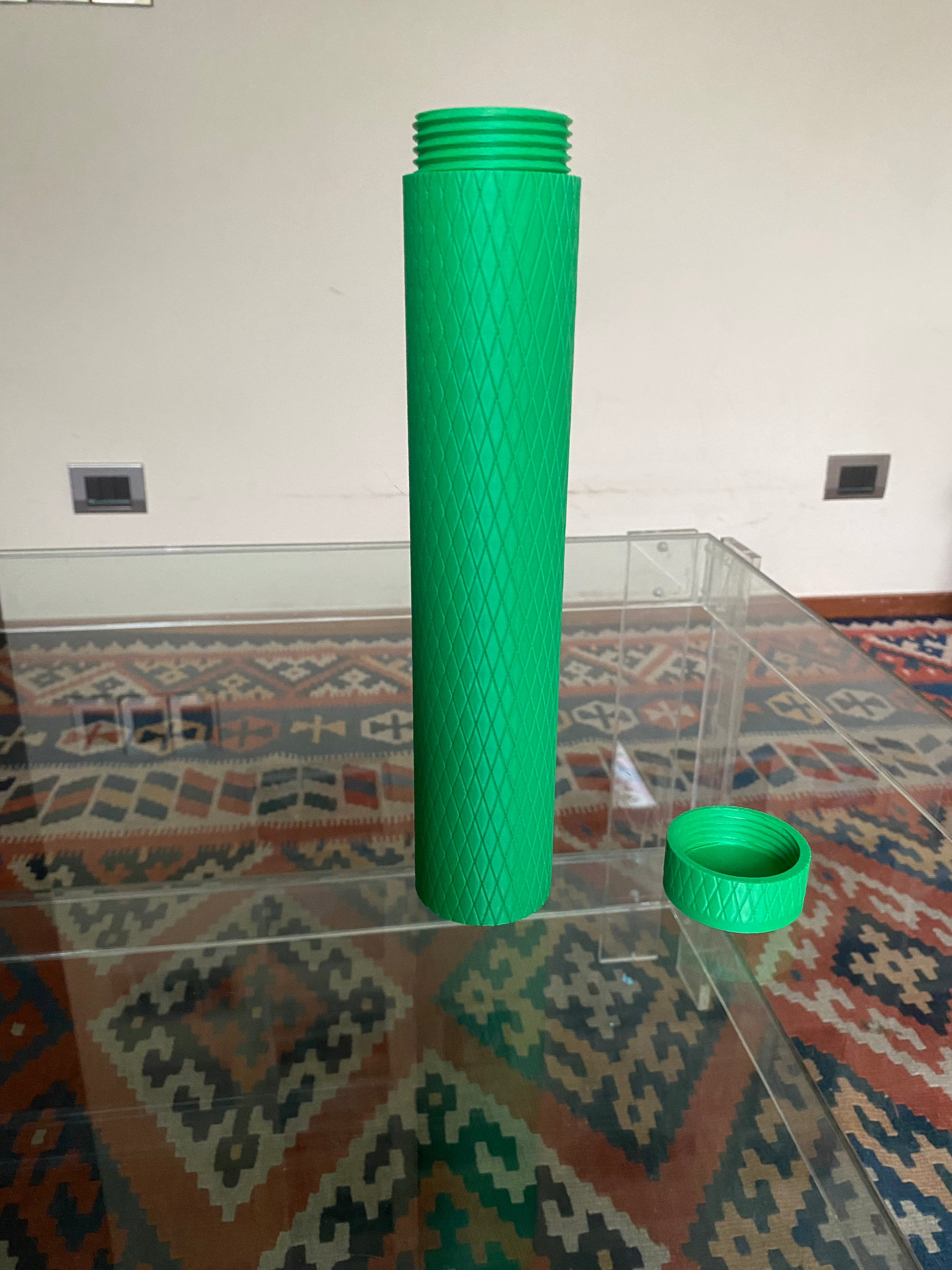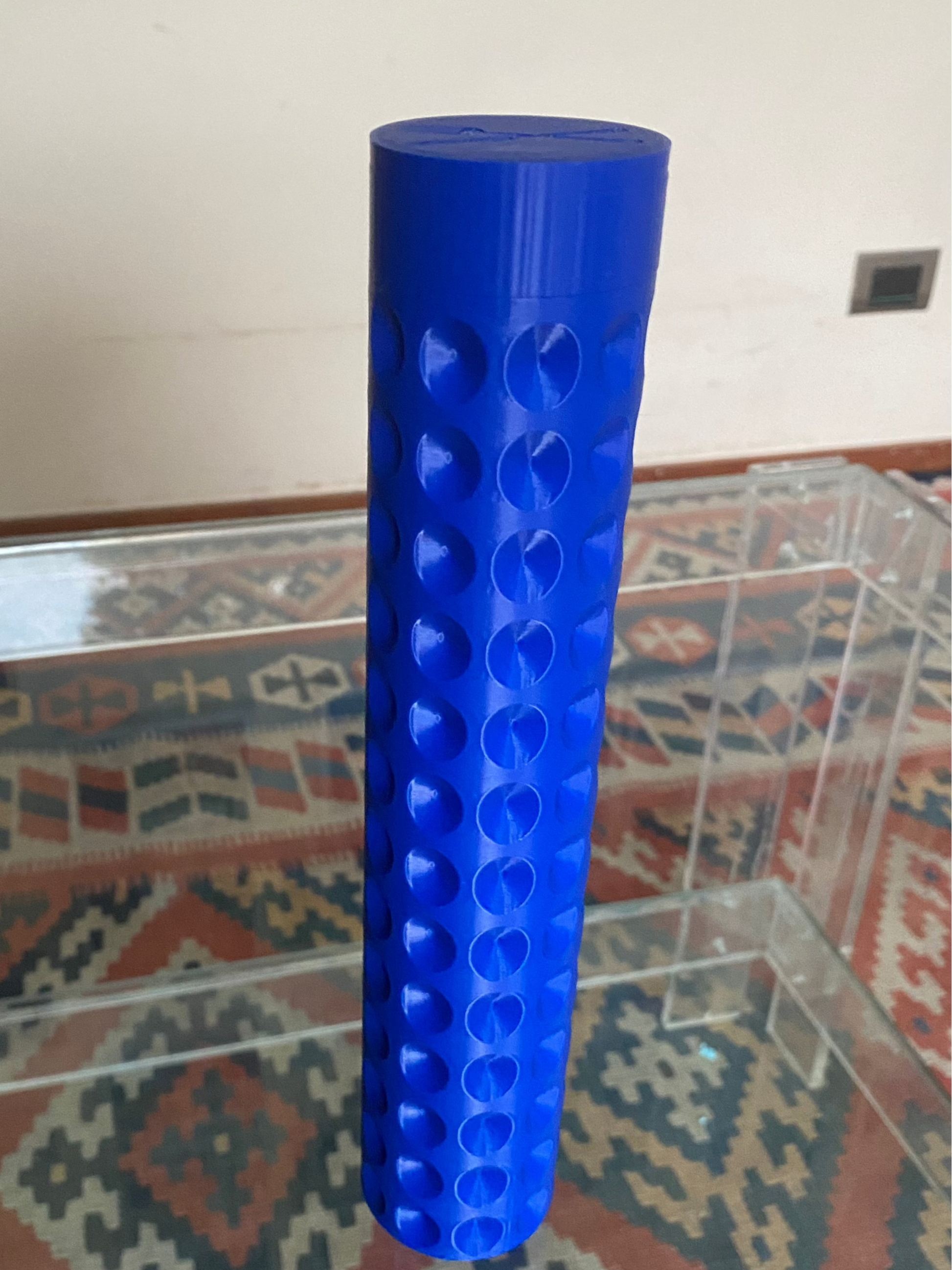 Mide 25 cm de alto y 5 cm de diámetro, ideal para llevar en cualquier bolso.